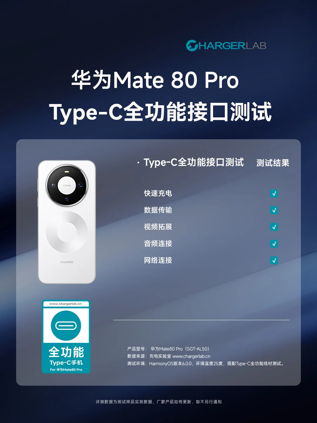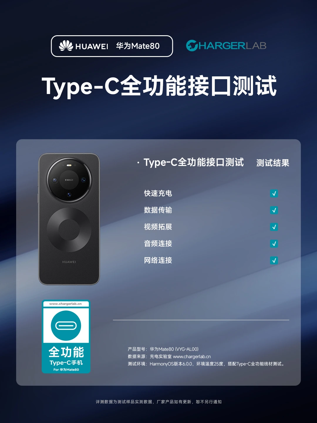 华为Mate80标准版通过 ChargerLAB充电实验室 Type-C全功能接口测试