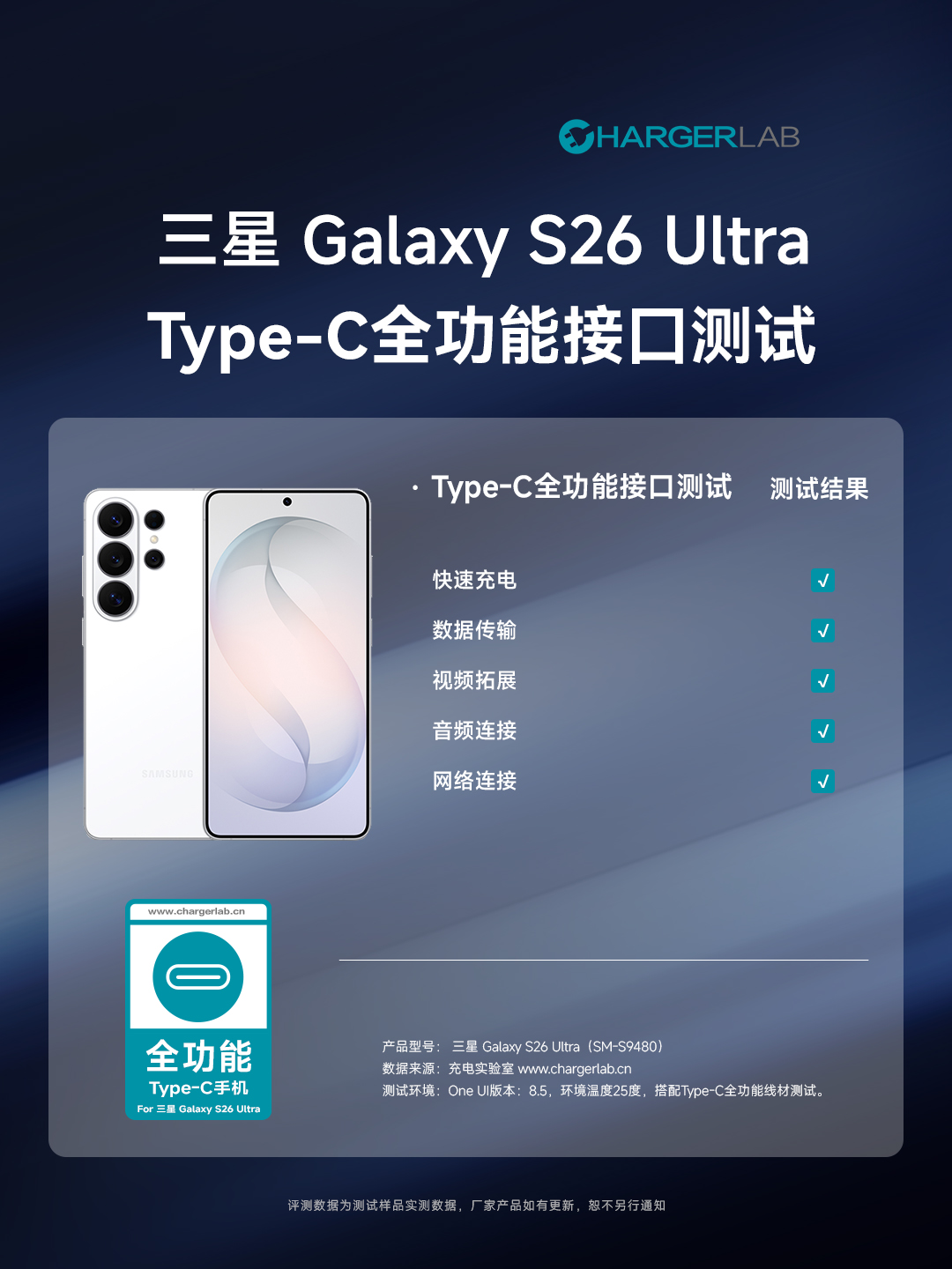 三星Galaxy S26 Ultra通过ChargerLAB充电实验室Type-C全功能接口测试