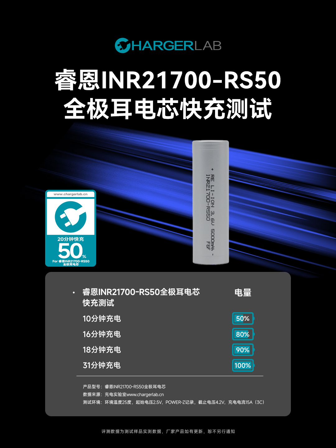 睿恩INR21700-RS50全极耳电芯 通过ChargerLAB充电实验室快充测试!