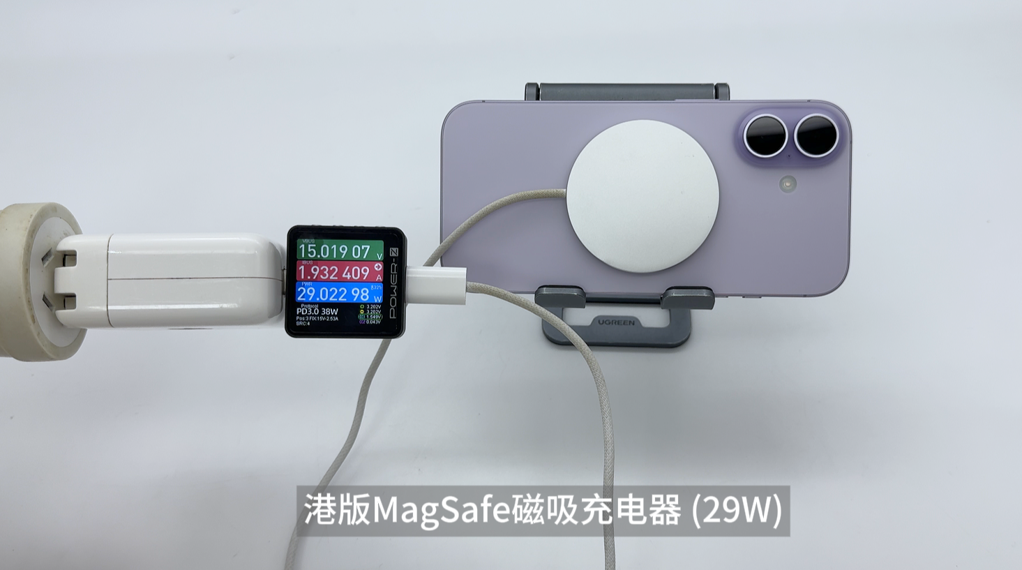 使用港版MagSafe磁吸充电器搭配苹果70W充电器为iPhone 17充电,使用POWER-Z KM003C检测仪测得功率为29W,触发的协议为MagSafe协议。