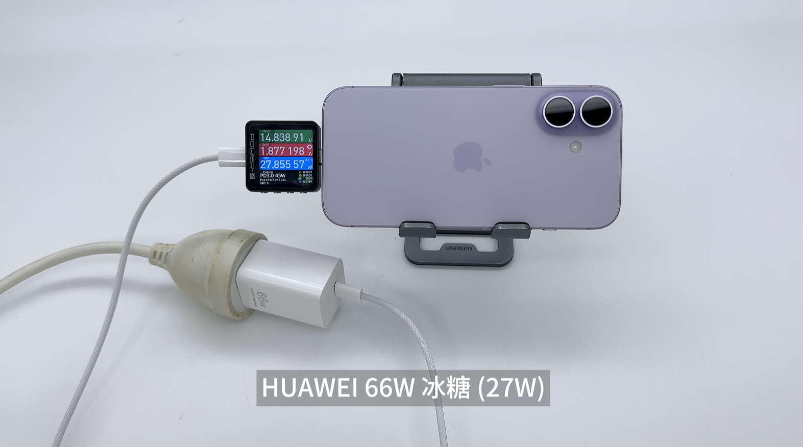 使用HUAWEI 66W 冰糖充电器为手机进行充电,使用 POWER-Z KM003C 测试仪读取充电功率为14.84V 1.88A 27.86W。
