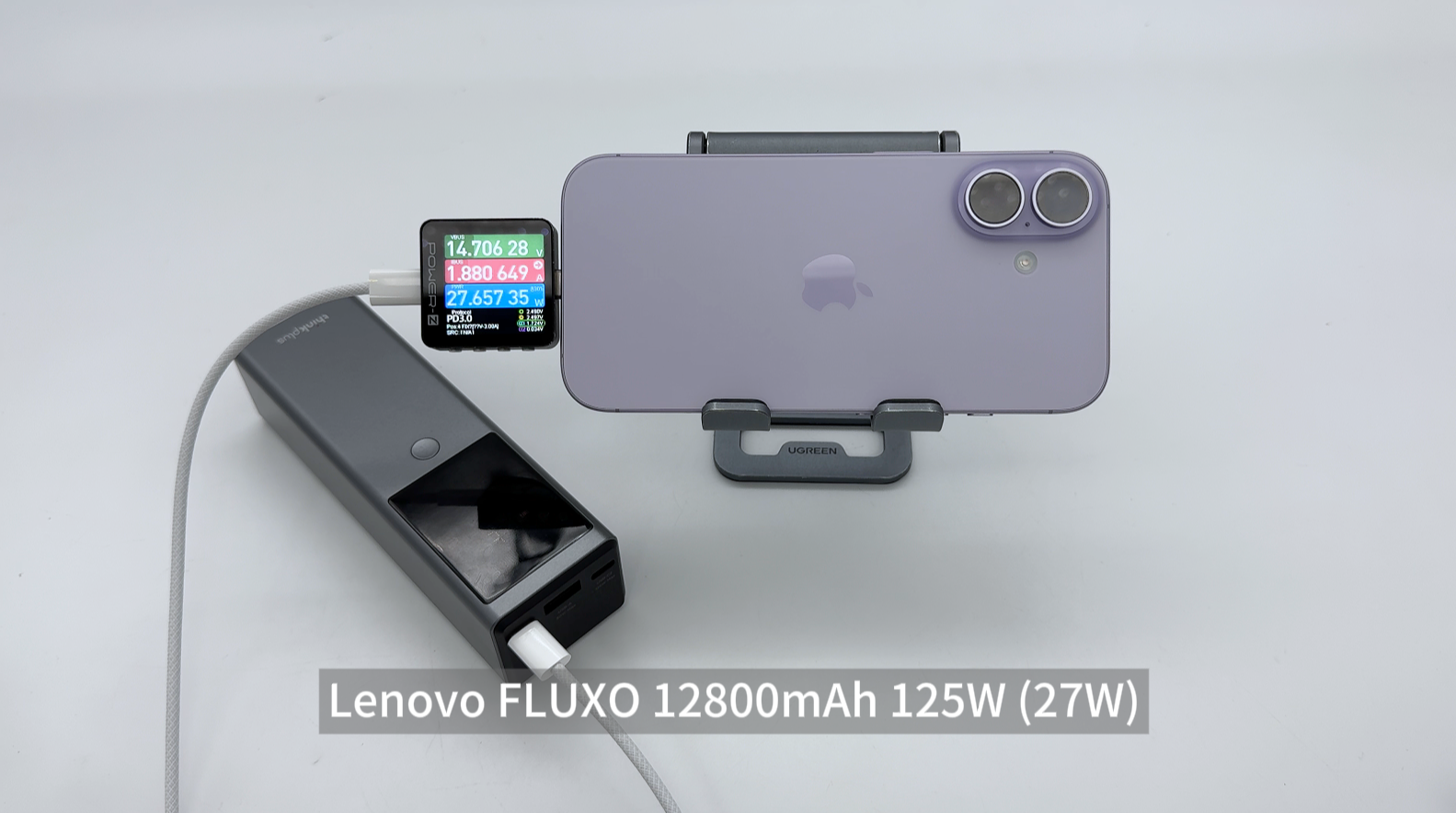 Lenovo FLUXO 12800mAh 125W充电宝为iPhone 17充电,同时使用POWER-Z KM003C测试仪读取充电功率为14.71V 1.88A 27.66W。