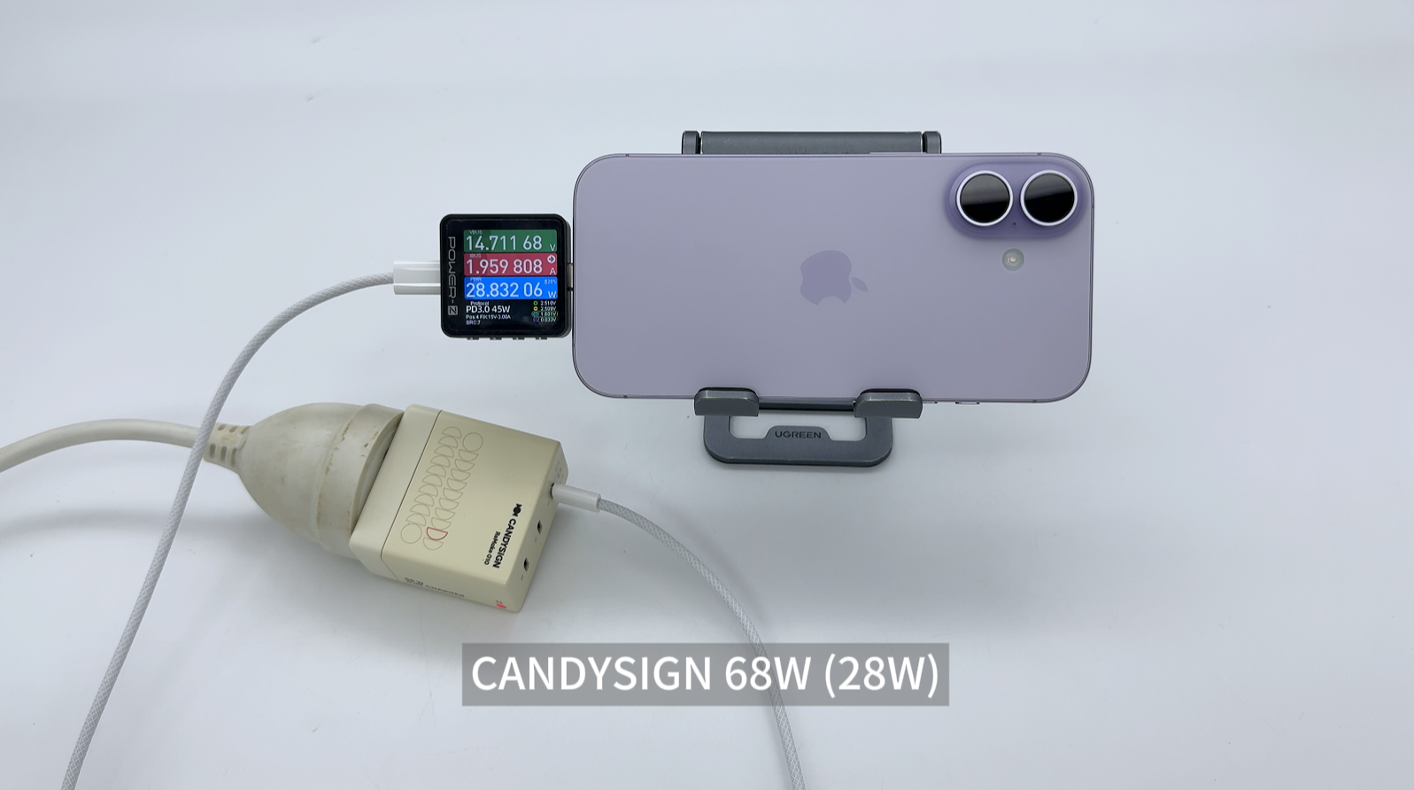 使用CANDYSIGN 68W充电器为手机进行充电,使用 POWER-Z KM003C 测试仪读取充电功率为14.71V 1.96A 28.83W。