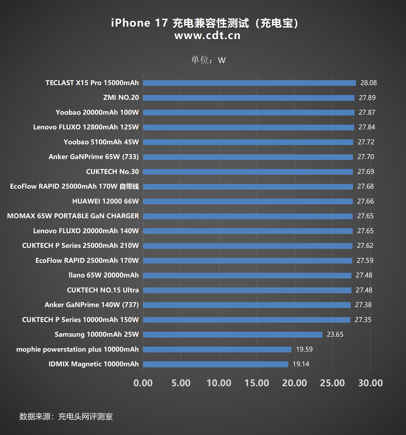 将充电功率数据绘制为柱状图,可以清楚的看出每款充电器充电功率的大小,本次测试中充电功率最高的是HuntKey 100W充电器,充电功率达到了30.49W,其次是nubia DAO 165W充电器,功率为30.25W,握手协议均为PD协议,整体来看大部分充电器能够跑满iPhone 17 手机自身所支持的充电功率,部分小功率充电器因自身所支持的PD功率并不高,实际充电功率也只能被限制在自身所支持的PD功率。