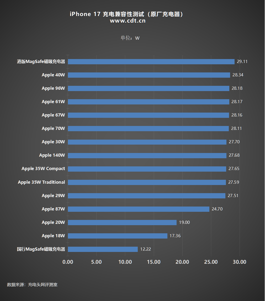 将所测数据绘制出柱状图,可以清晰的看出每款原厂充电器的功率大小,可以看到充电功率最高的是港版的MagSafe磁吸充电器(29.11W),功率超过原厂有线充。苹果87W由于没有15V档位,这里握手9V3A 功率为24.7W,其余原厂充电器功率基本都在28W左右,部分小功率充电器也能达到标称功率最大值。