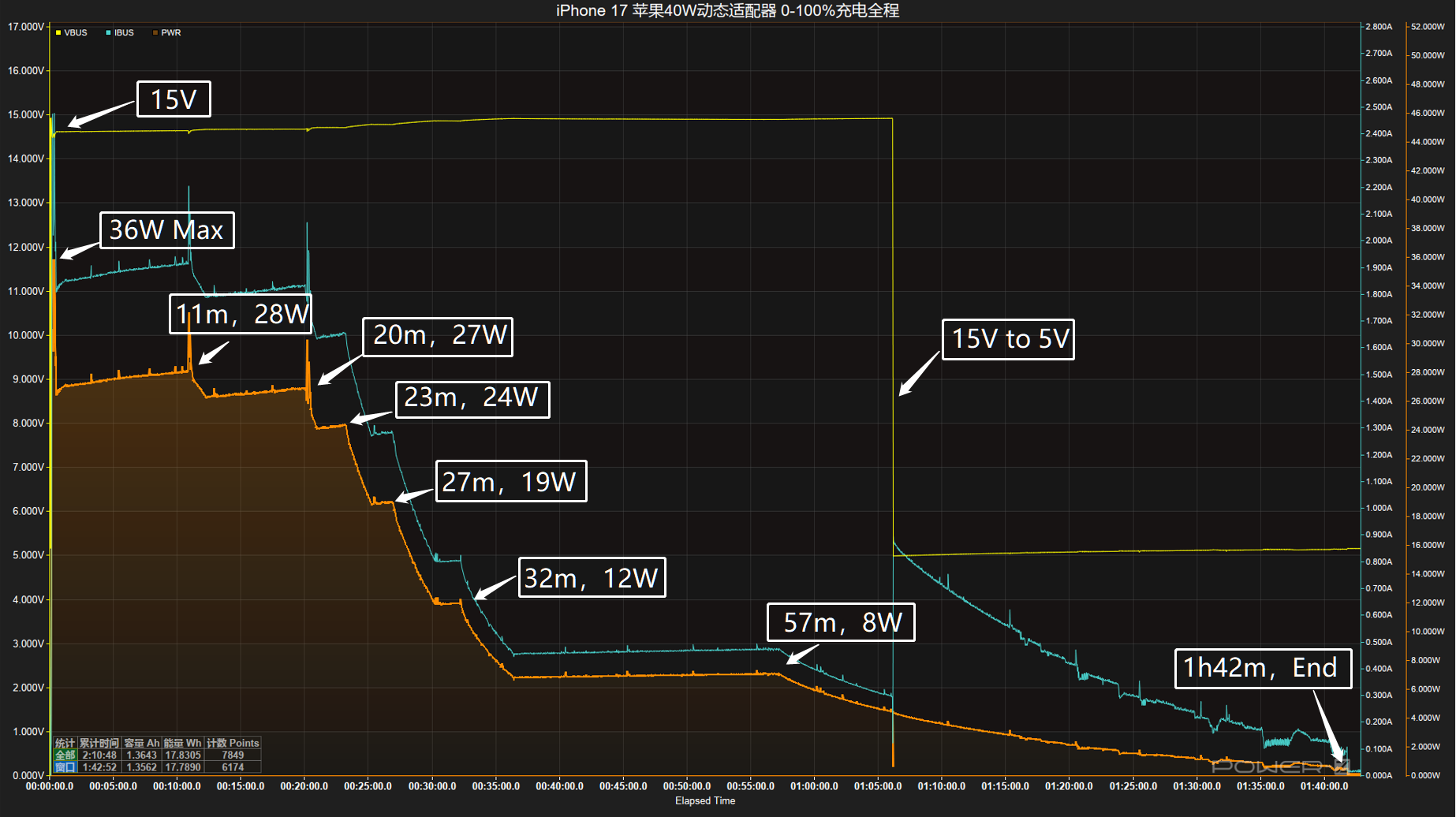近日,iPhone 17 通过了 ChargerLAB 充电实验室的2050快充测试。