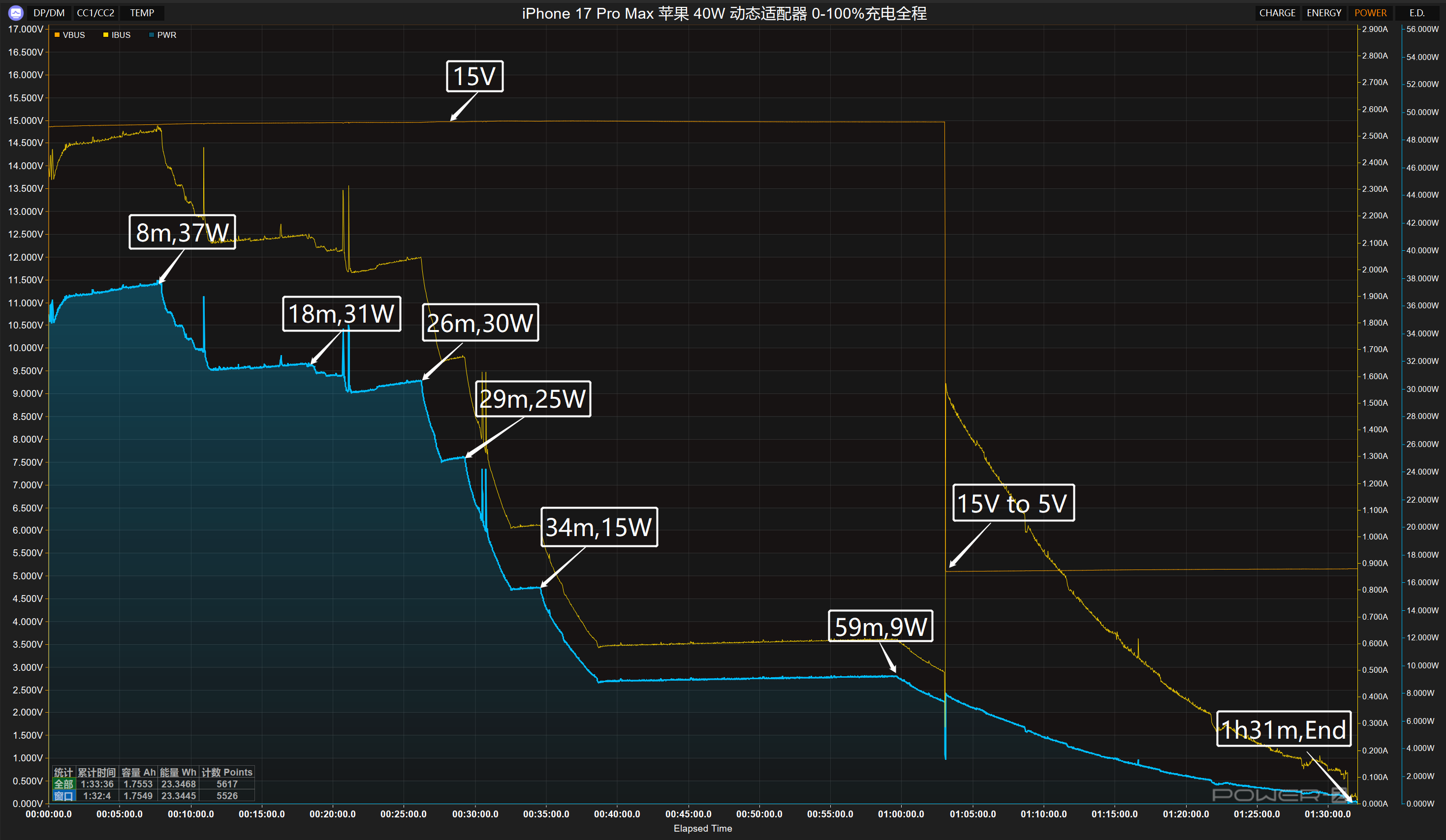 近日,iPhone17 Pro Max 通过了 ChargerLAB 充电实验室的2050快充测试。