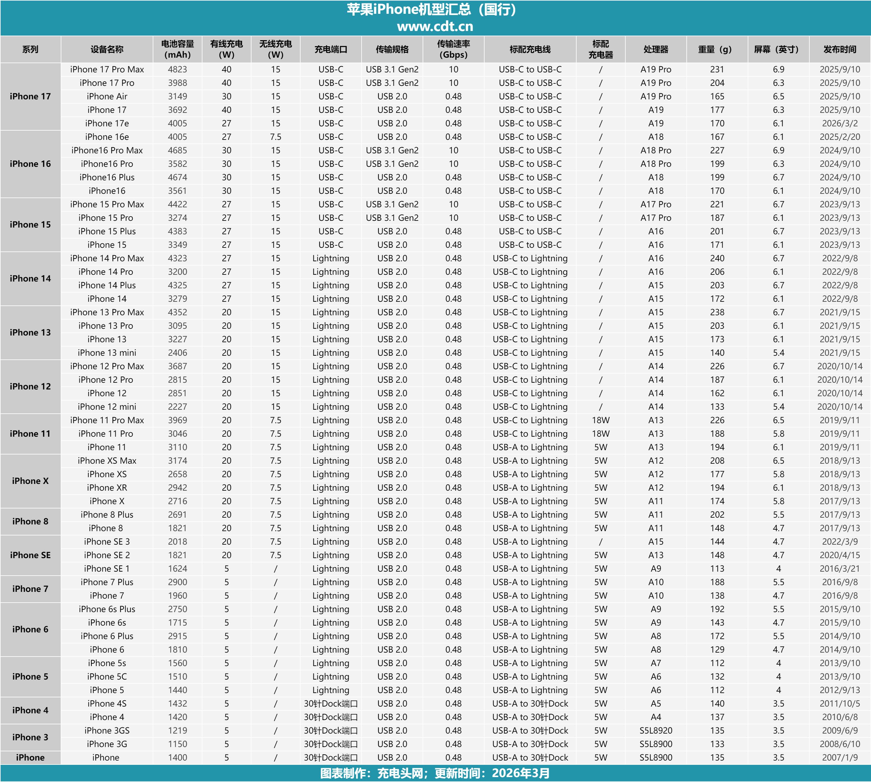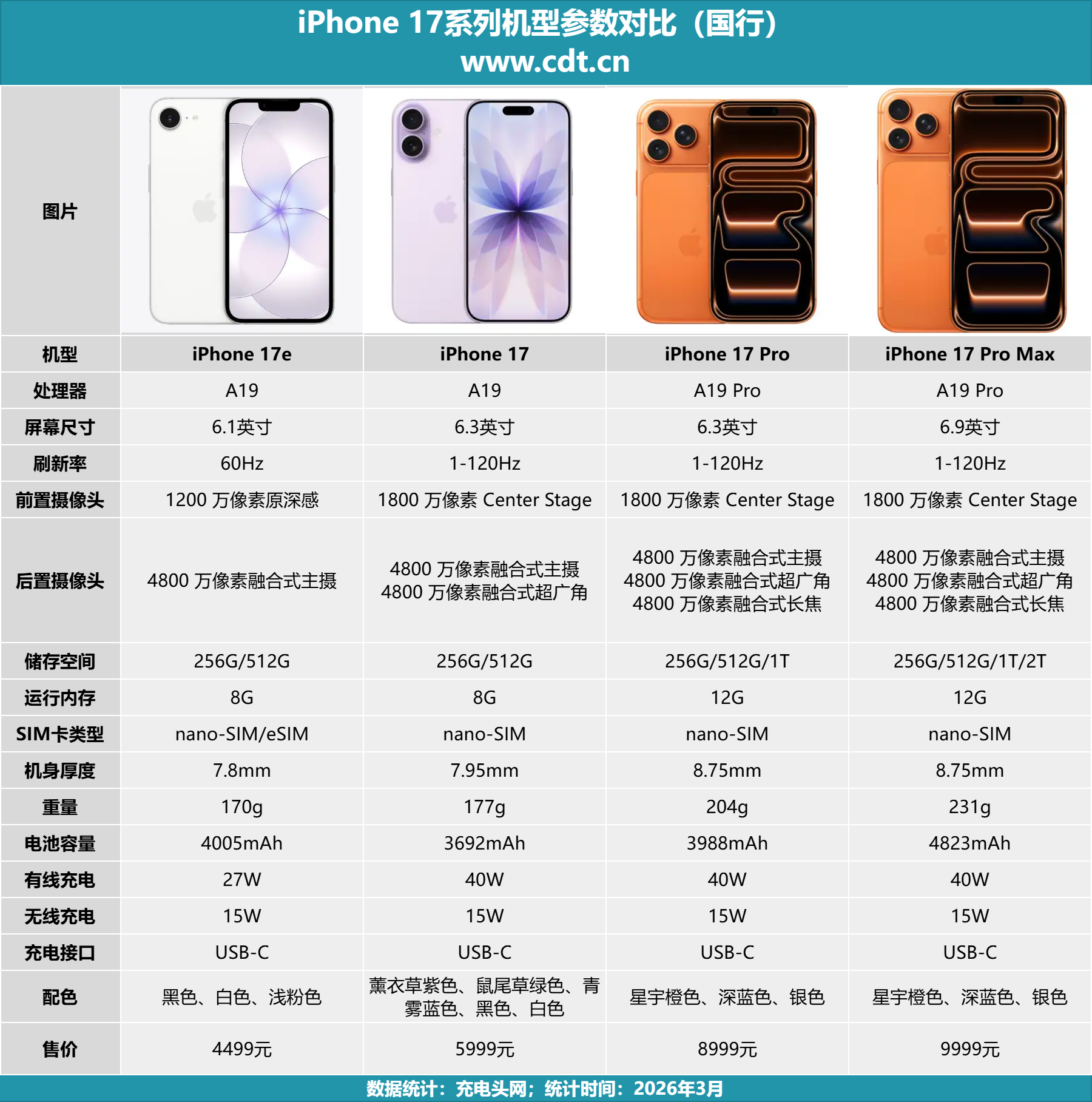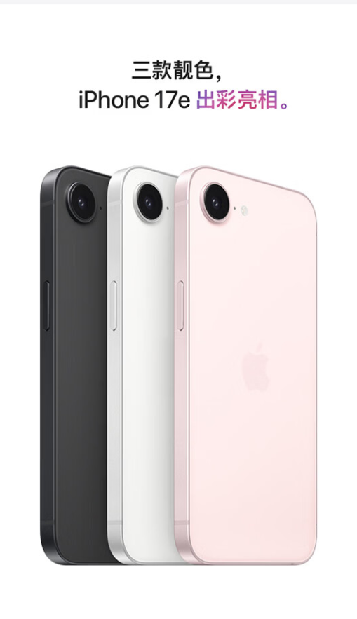 iPhone 17e 于2026年3月2日全球发布、3月11日正式开售,搭载A19芯片与 6.1 英寸超视网膜XDR OLED屏,内置4005mAh电池,支持27W有线快充与 15W MagSafe/Qi2 无线充电,配备 Wi‑Fi 6E、蓝牙 5.3 与完整全球网络频段。