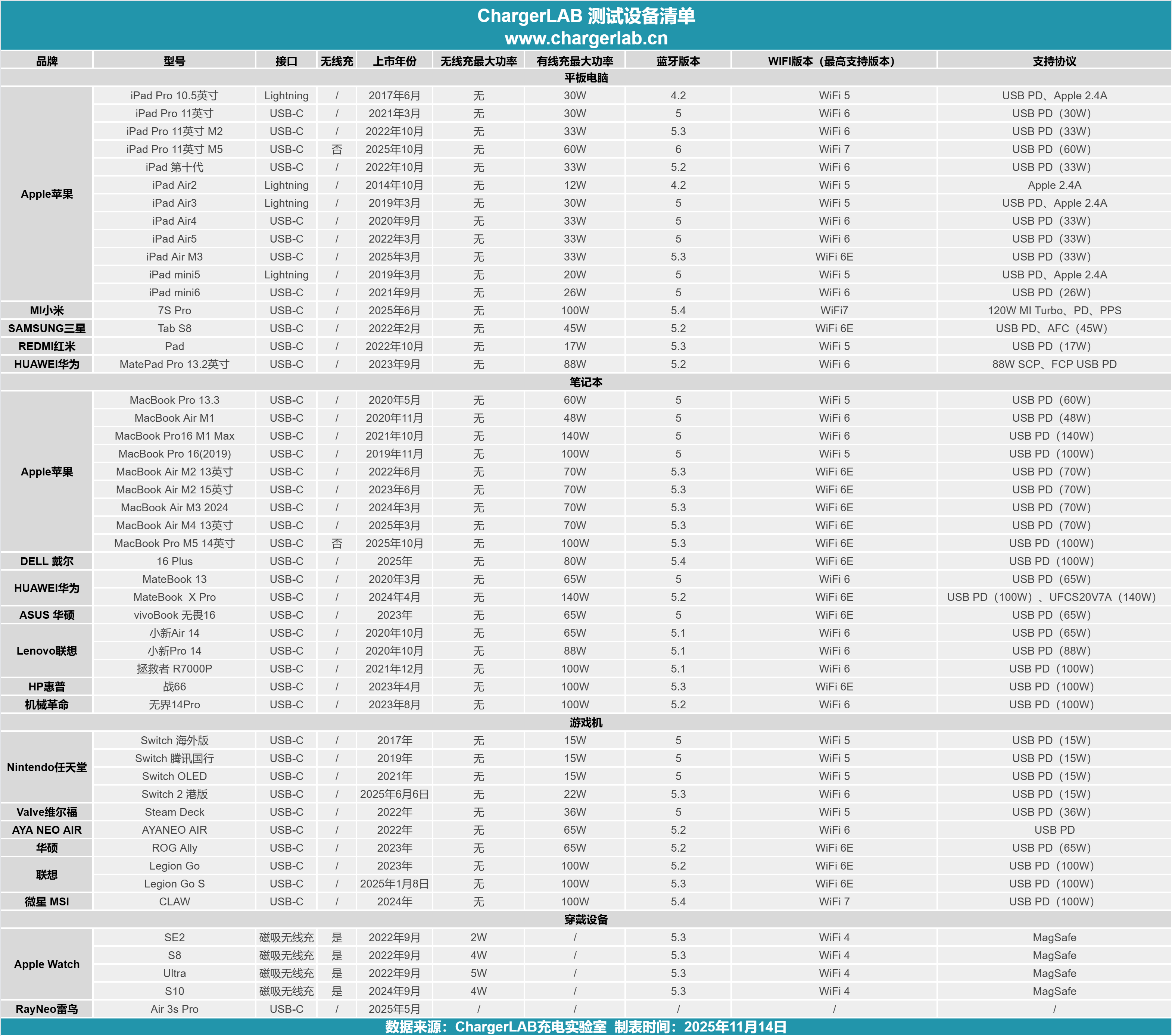截至2025年11月中旬,ChargerLAB充电实验室已构建起覆盖多品类、全主流品牌的测试设备矩阵,累计设备达257款。其中包括208台手机、16台平板电脑、18台热门笔记本、10台掌上游戏机及5台穿戴设备,品牌涵盖苹果、华为、荣耀、小米、OPPO、vivo、三星等;同时配备170个新款及各主流品牌原装充电器、数据线,另有20款充电宝、11 款户外电源,以及4K显示器、Mac Studio、Mac Mini、变压器等测试设备。