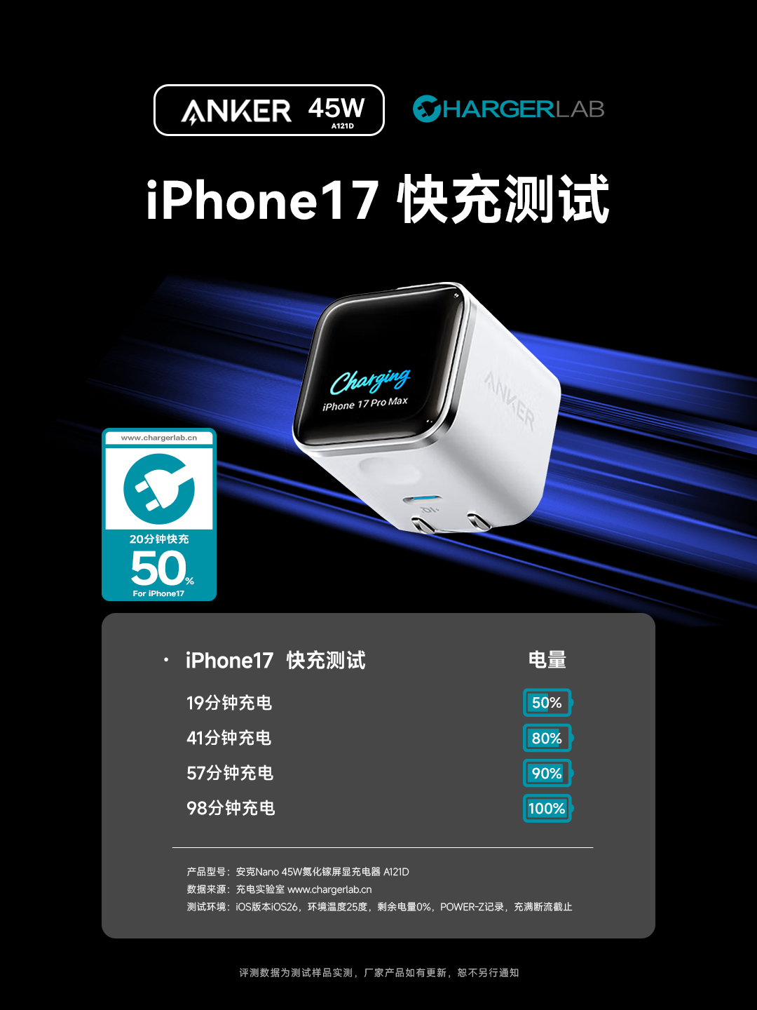近期,安克Nano45W氮化镓屏显充电器通过了 ChargerLAB 充电实验室的 iPhone 17 系列快充测试,表现十分亮眼。其中: