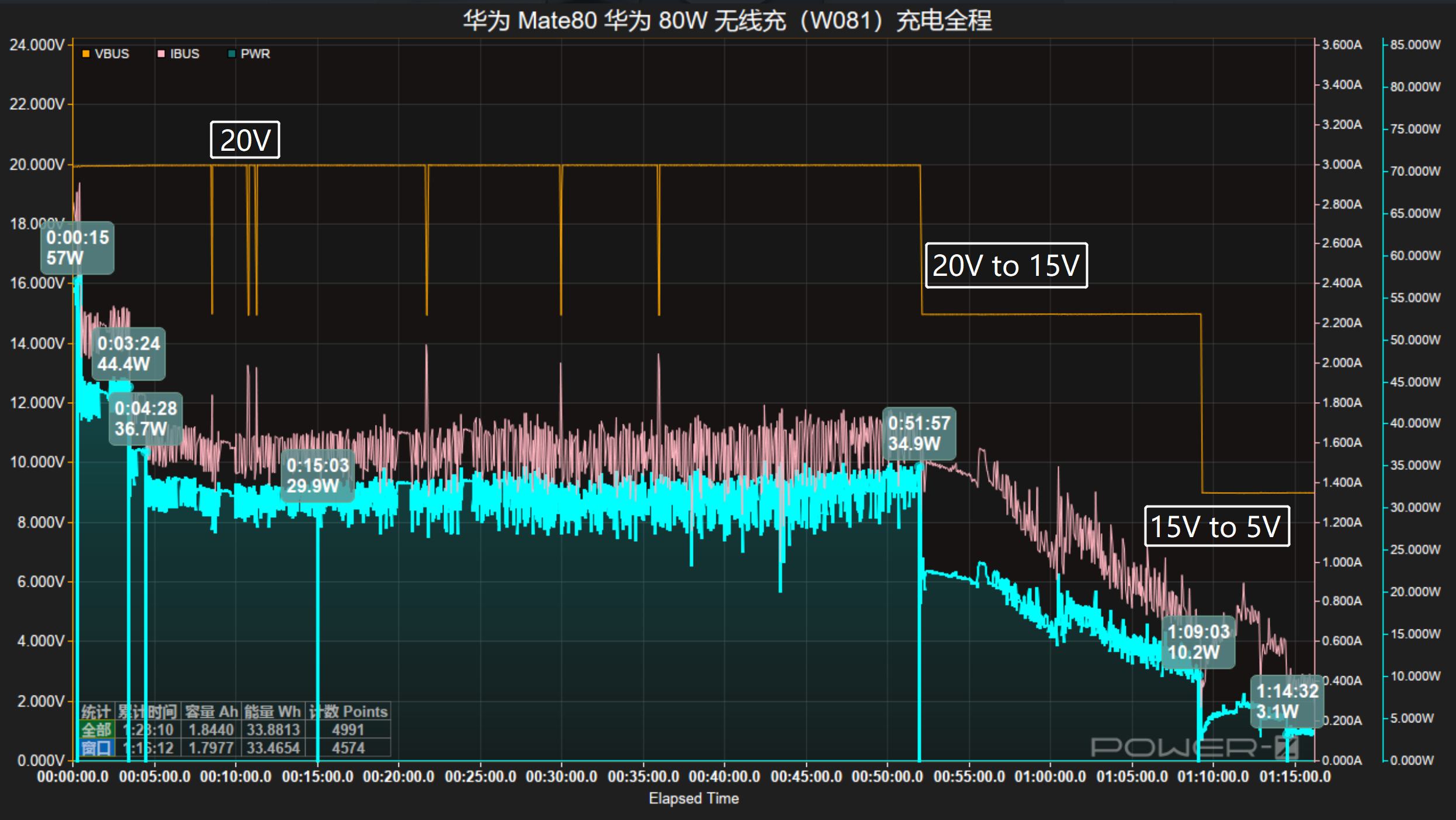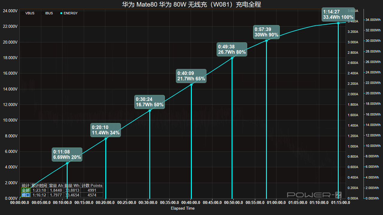 接通电源后握手20V电压,随后功率最高爬升至57W,随后功率下降至44W,维持3分钟后功率再次下降至36W,维持1分钟后功率再次下降,随后47分钟内功率在30-33W区间波动,第51分钟时重新握手15V电压,同时功率持续下降,在第1小时9分钟重新5V电压,并以5W左右功率持续充电直至结束,总耗时1小14分钟。
