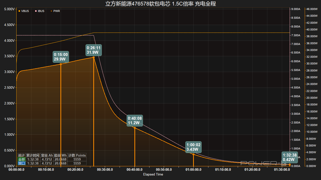 接通电源后可以看到电压、功率持续上升,在26分钟左右充至4.2V,功率达到最高31W,随后进入涓流充电,66分钟后充电完成,总耗时1小时32分钟。
