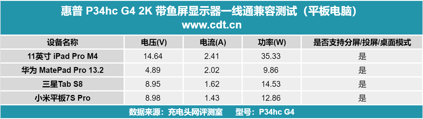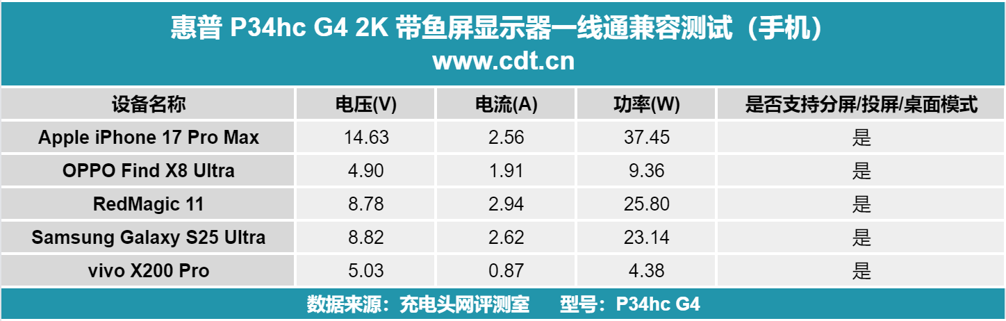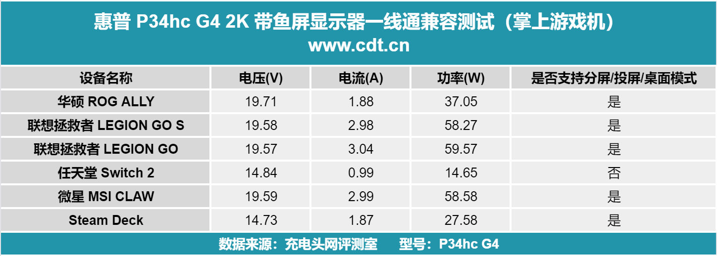 综合来看,惠普 P34hc G4 2K 带鱼屏显示器的全功能 Type-C 接口在 ChargerLAB 充电实验室五项测试中表现亮眼,展现出强劲的实用性与兼容性。满足轻薄本日常供电需求,同时可稳定适配手机、平板、笔记本、掌机等多类设备,均能正常触发镜像或拓展 / 桌面模式,连接流畅无卡顿。