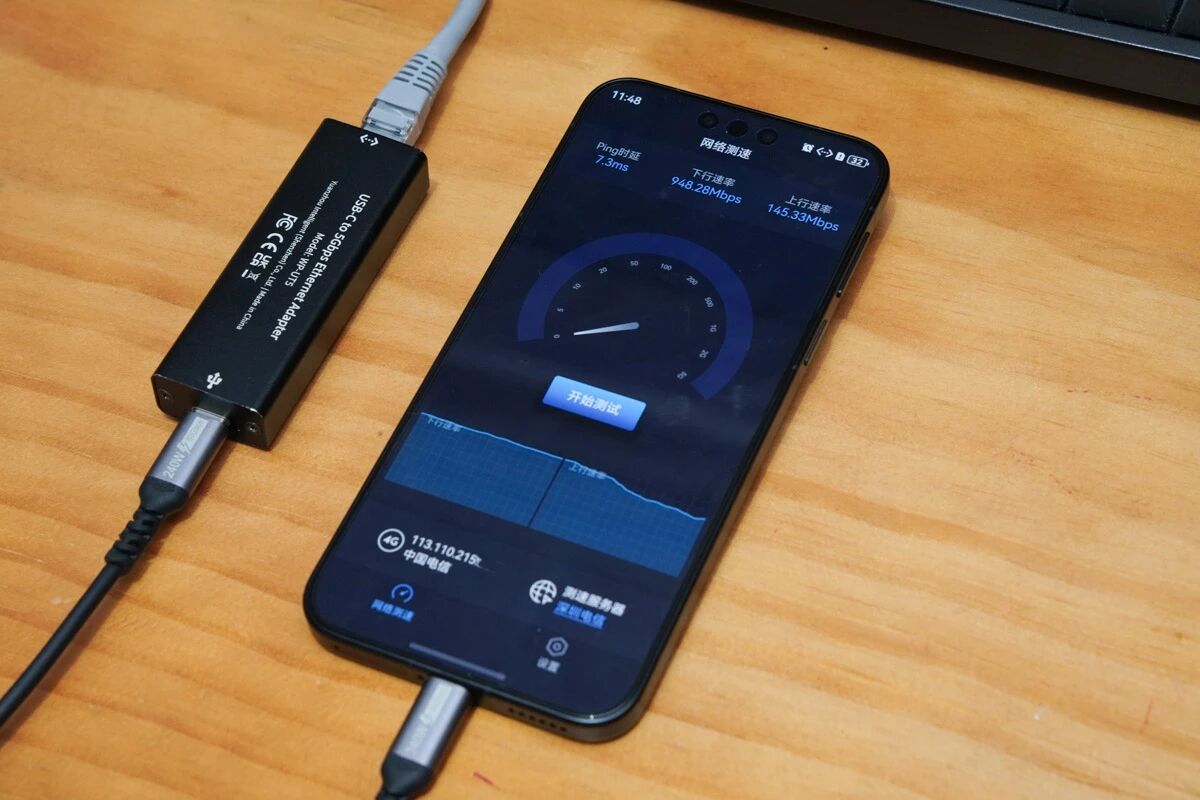 5.网络连接:使用LAN口的Type-C HUB与手机连接,在千兆网线速率下,实测手机下行速率约为948.28Mbps。