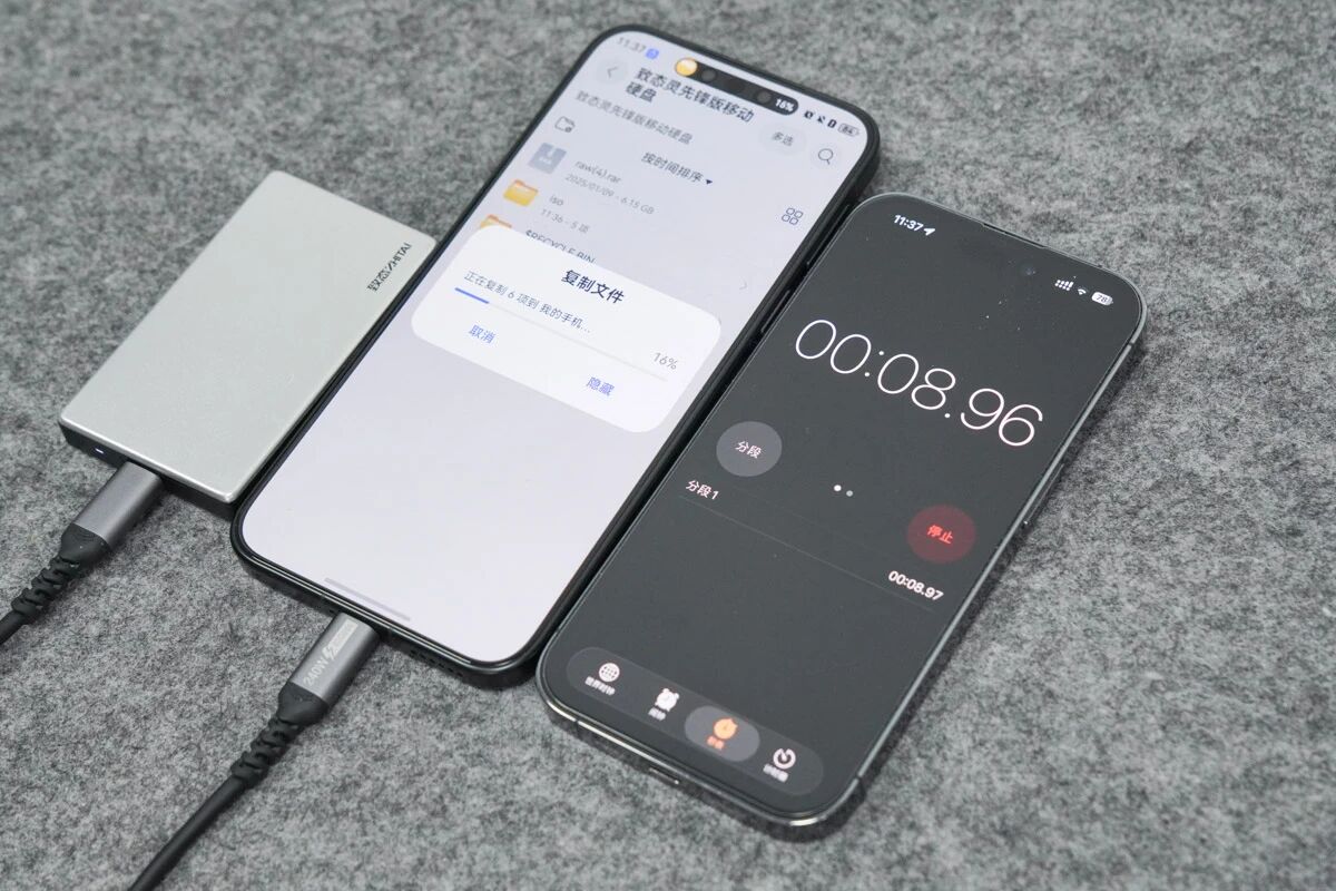 2.数据传输:实测从手机内传输8.2GB视频文件到硬盘中耗时约48.45秒,传输的速率约为 170.8MB/s。将该文件从硬盘导入手机中耗时约40.4秒,传输的速率约为 207.7 MB/s。
